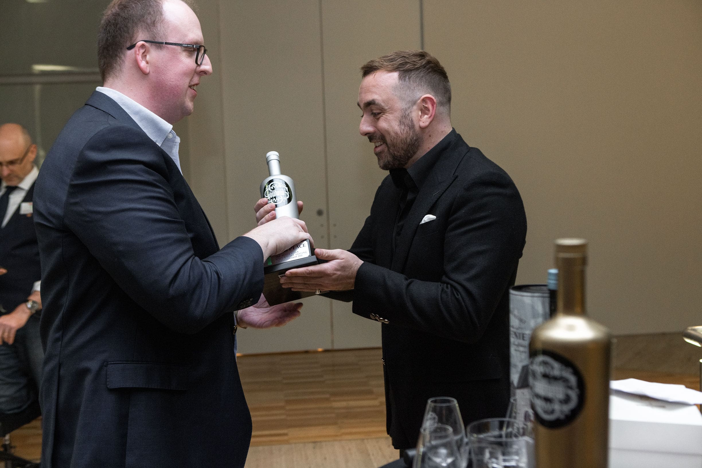 A jubilant Seamus Carroll receiving the trophy for 1st Place from Andrew Derbidge of The Scotch Malt Whisky Society