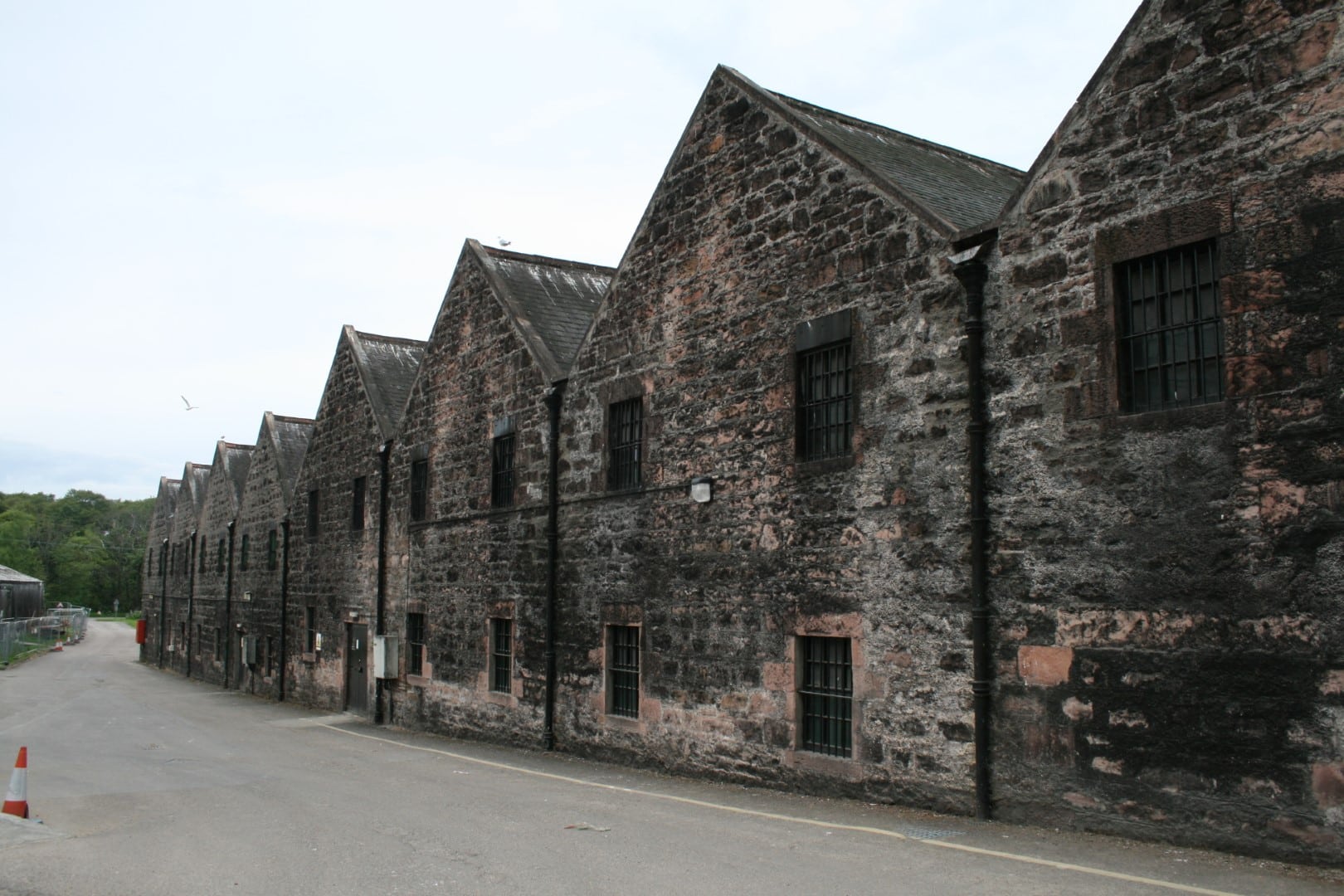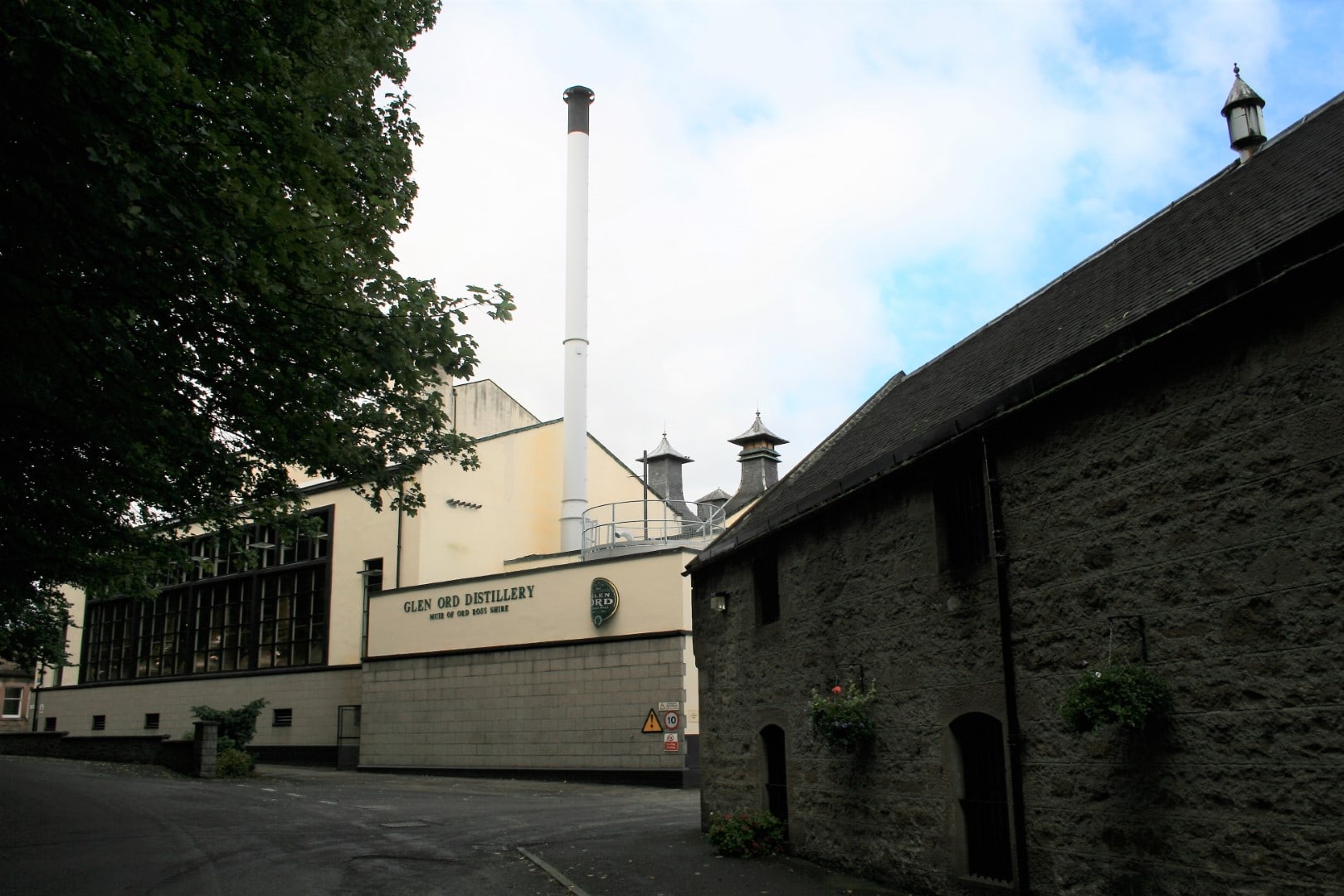 The Glen Ord distillery. One of the warehouses is immediately on the right; the original stillhouse is beyond, where you can see the stills through the windows. A new and second stillhouse was recently built to accommodate eight new stills as part of the distillery’s expansion.